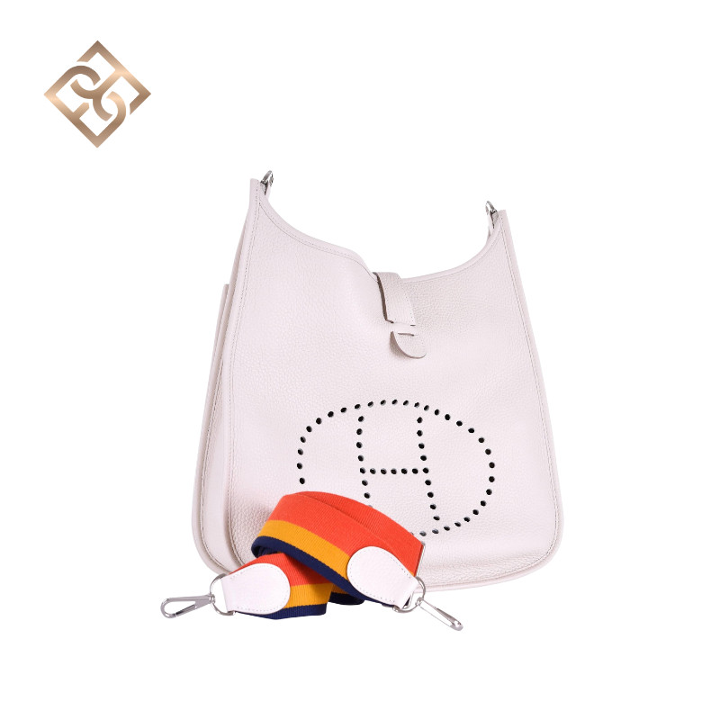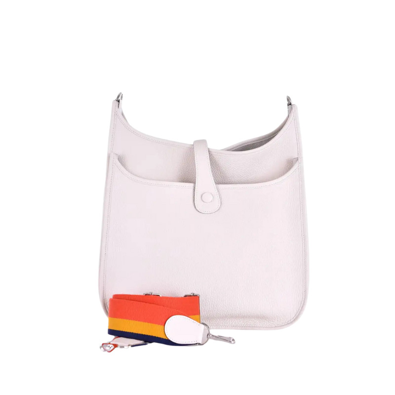 This Hermès Evelyne III GM bag is of Craie Clemence leather with palladium hardware, tonal stitching, large perforated H in circle (front), pull tab top snap closure and removable, adjustable Craie shoulder/crossbody strap.