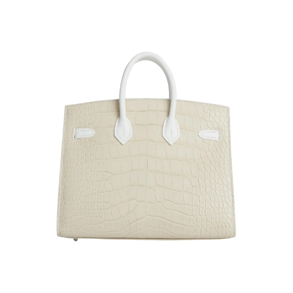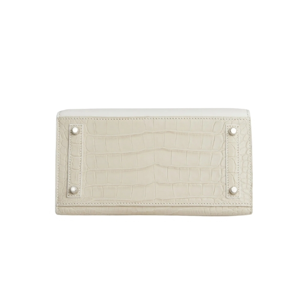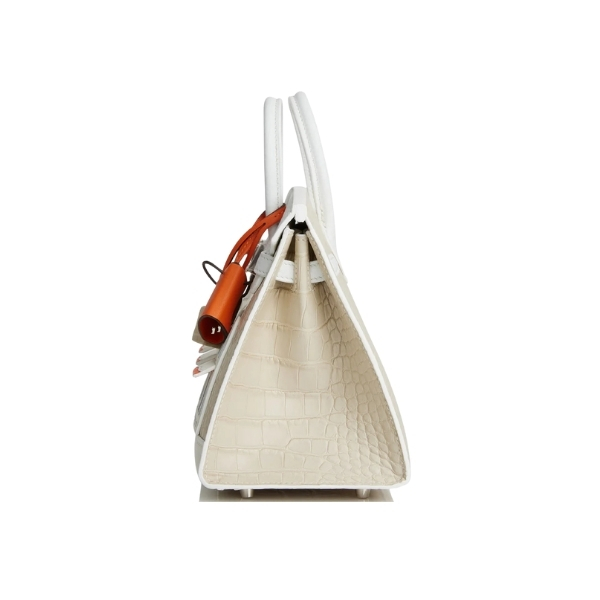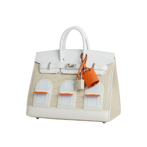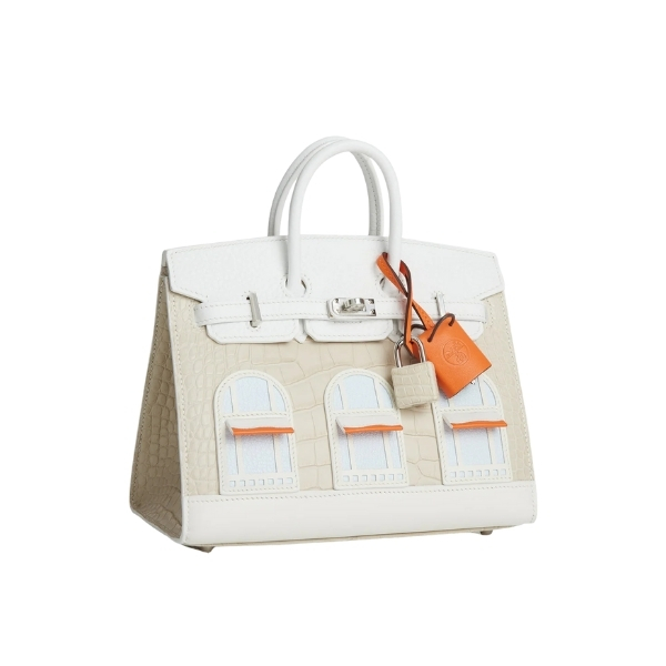 This extremely rare VIP Birkin is in a combination of five different leathers and an alligator skin with palladium hardware. The body of the bag is in white matte alligator; the front flap, handles and strap are in white leather; the awnings, tiret and “shopping bag” clochette are in Orange H swift leather; the trim is in white Sombrero; the window panes are in Craie epsom leather and the base is in white Sombrero leather.
