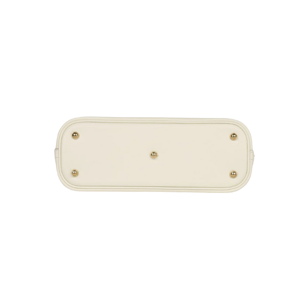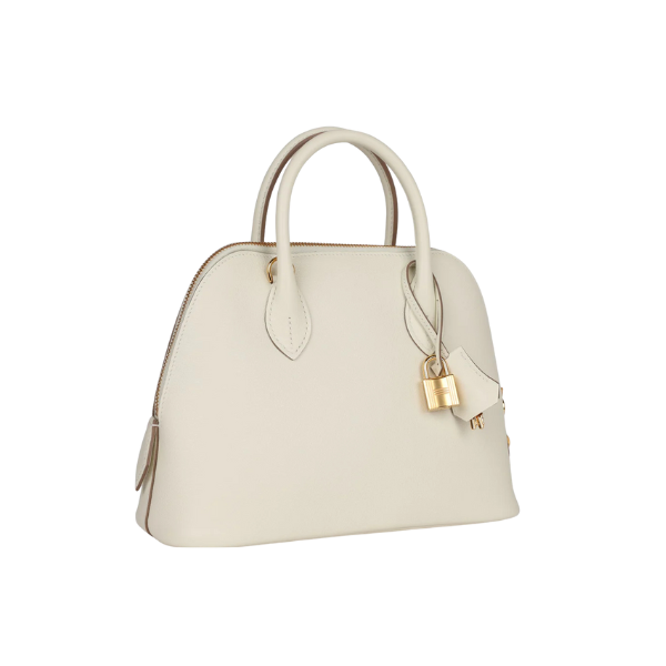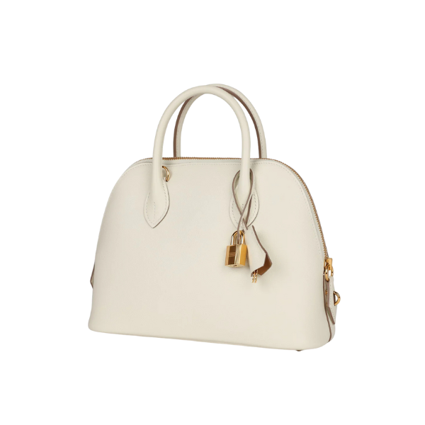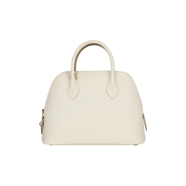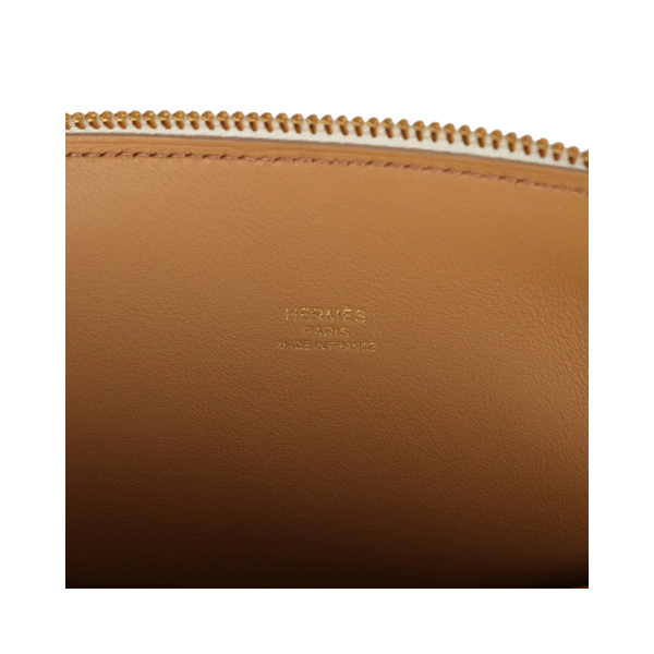 This 1923 Bolide is in Mushroom evercolor leather with gold hardware and has tonal stitching, a top zipper closure, double rolled handles and removable shoulder strap.