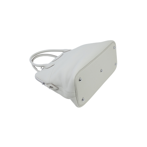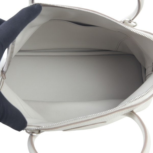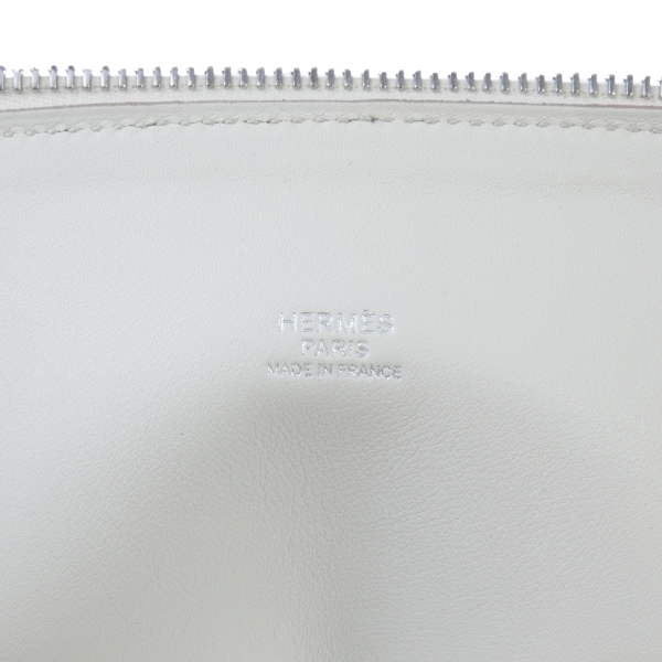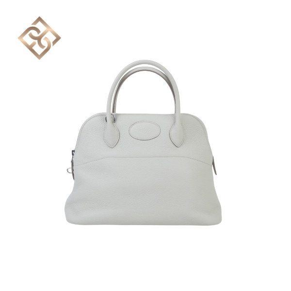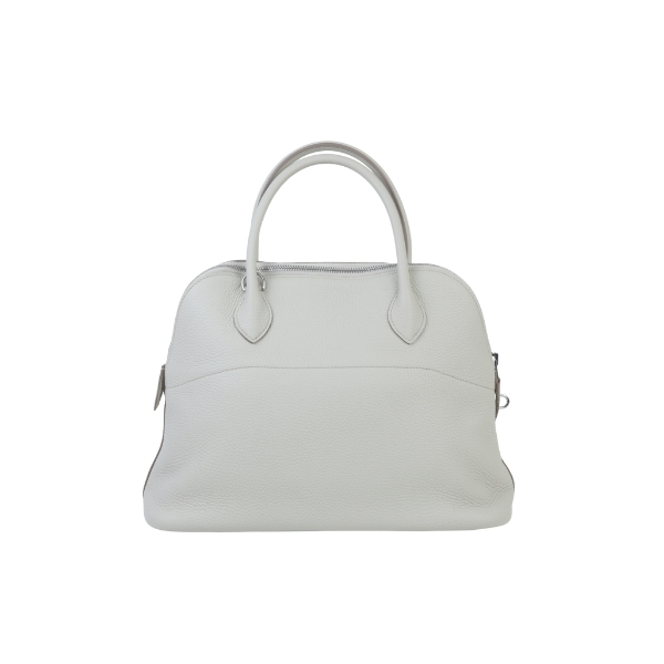 This Bolide 31 is in Beton Clemence leather with palladium hardware, has tonal stitching, a top zipper closure, double rolled handles and a removable shoulder strap.