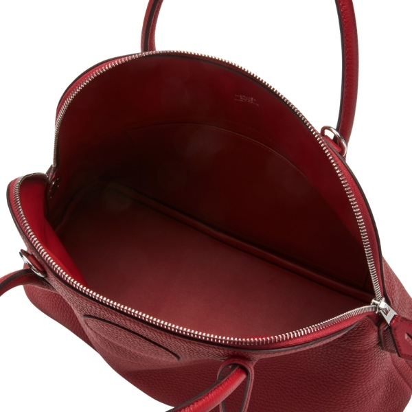 The interior is lined in tonal swift leather Includes lock, two keys, clochette, clochette dustbag, shoulder strap, shoulder strap dustbag, dustbag, care card, raincoat, and box.
