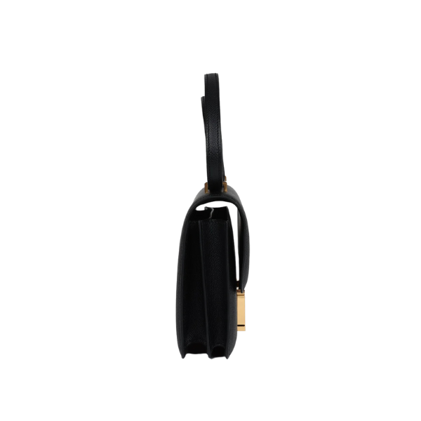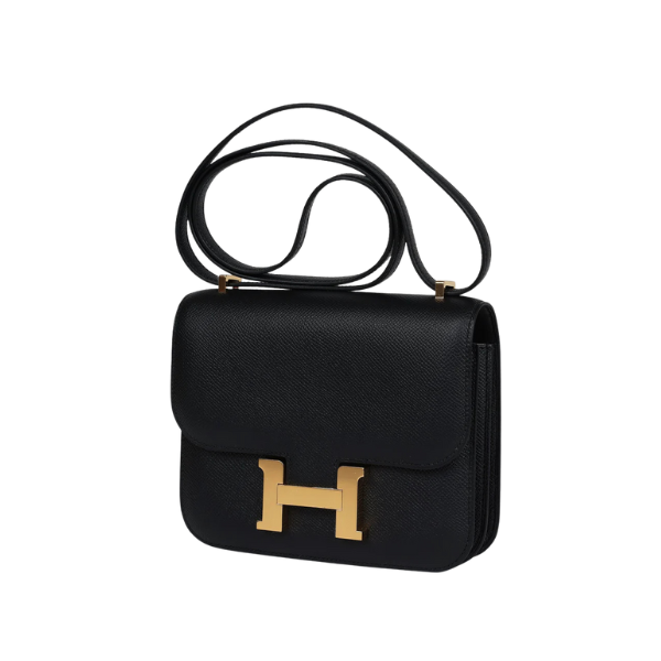 This Constance is in Black epsom leather with gold hardware and has contrast stitching, a metal “H” snap lock closure and adjustable shoulder strap.