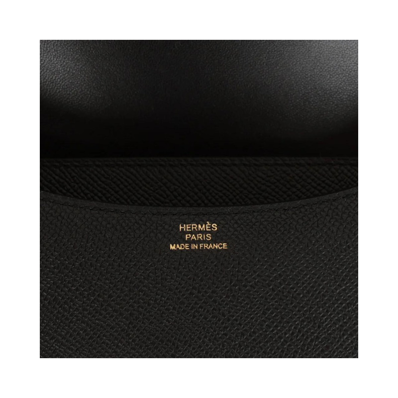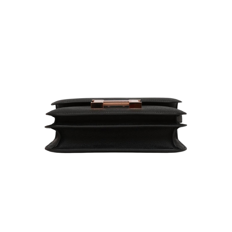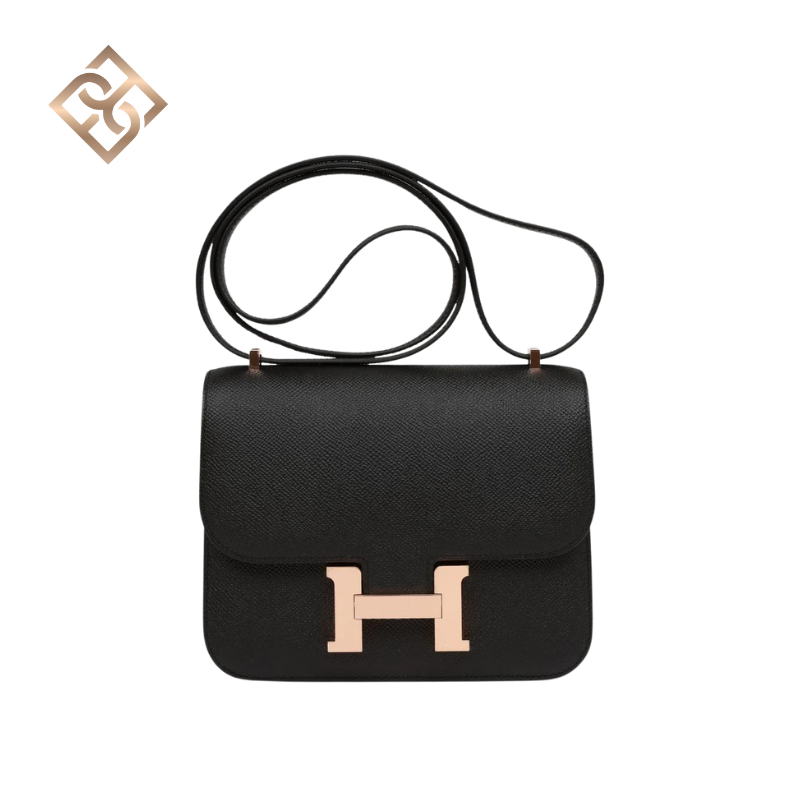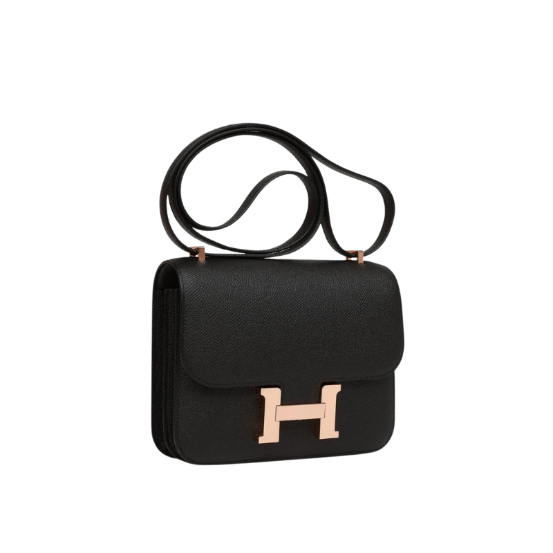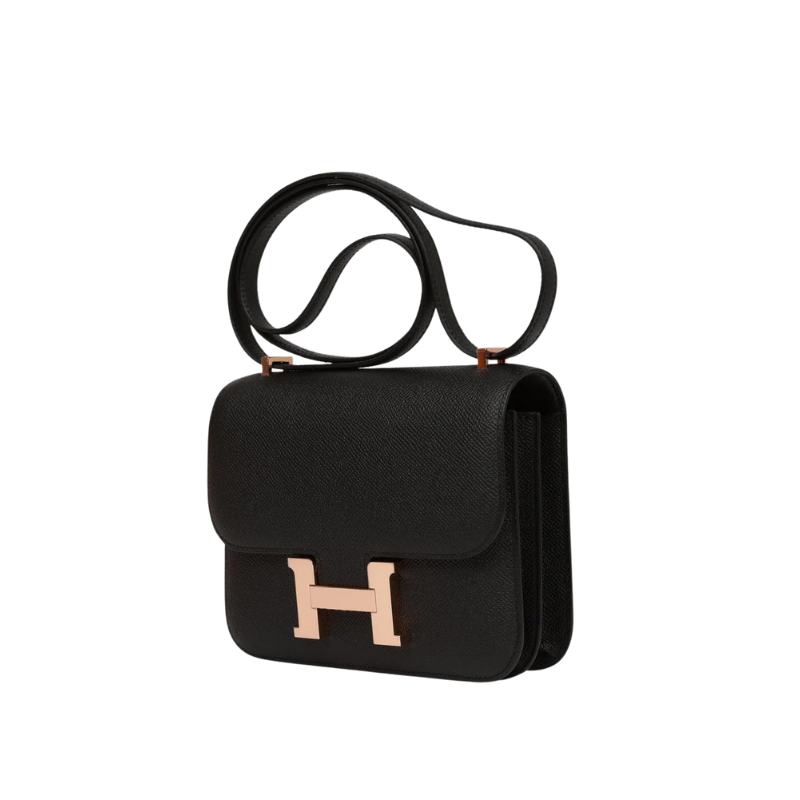 This Constance is in Black epsom leather with rose gold hardware and has tonal stitching, a metal “H” snap lock closure and adjustable shoulder strap.