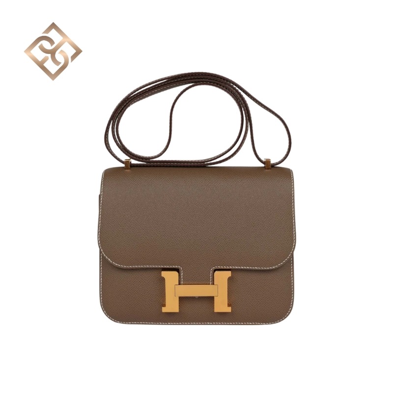 This Constance is in Etoupe epsom leather with gold hardware, has contrast stitching, a metal “H” snap lock closure and adjustable shoulder strap.