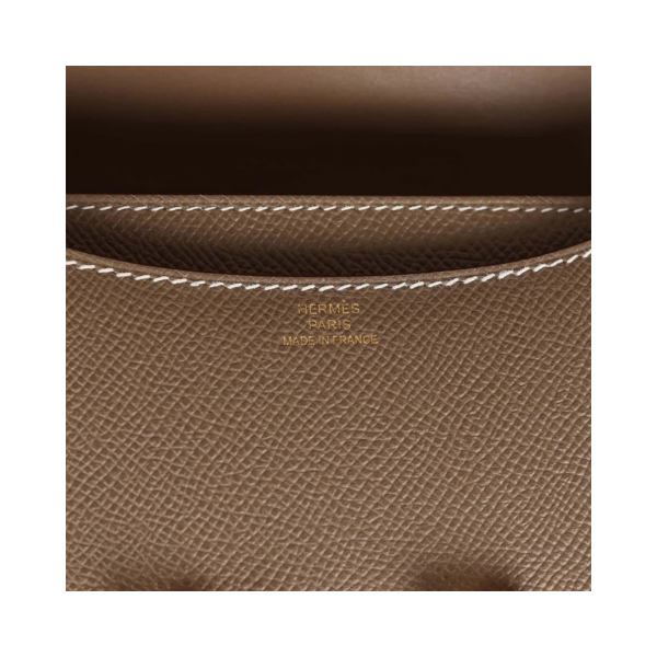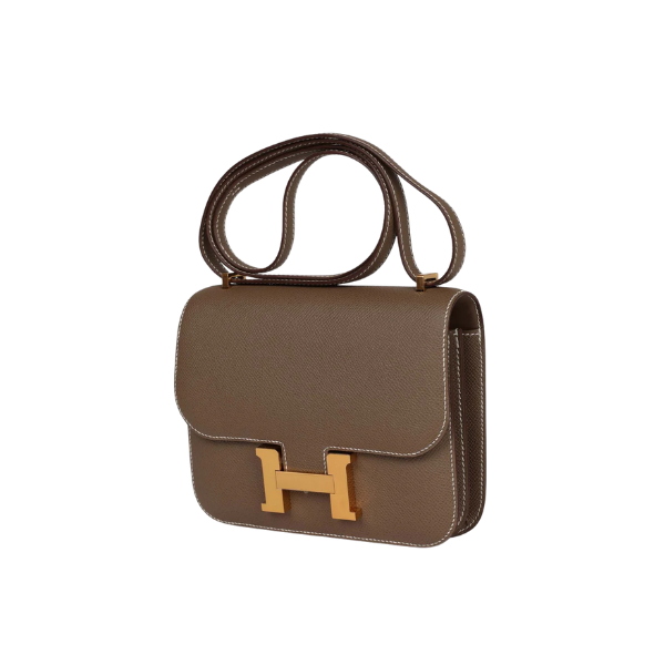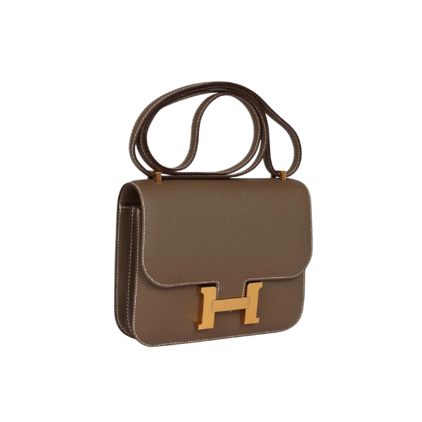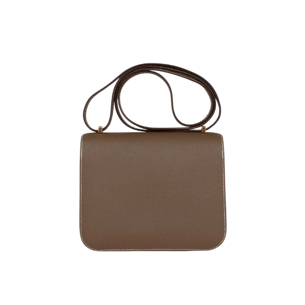 This is an authentic HERMES Constance 18 in Etoupe Epsom Gold Hardware. This stylish shoulder bag is finely crafted of epsom calfskin leather in taupe. The bag features a long shoulder strap with gold-plated hardware, including an H buckle on the flap. This opens to a compact partitioned leather interior with flat pockets.
