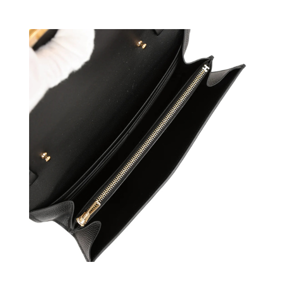 The interior is lined with Black leather and two main compartments with six credit card slots and a zippered center compartment with Hermès H lock pull.