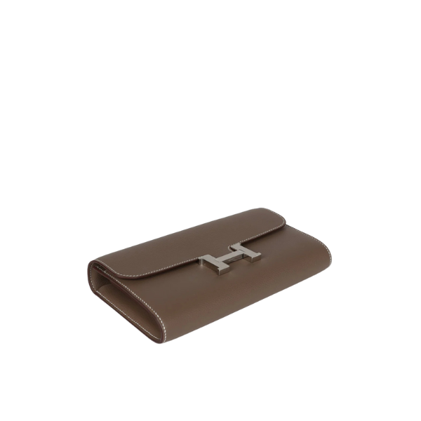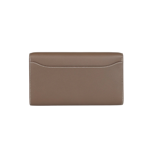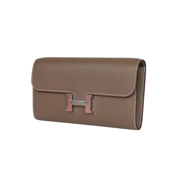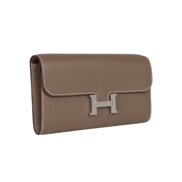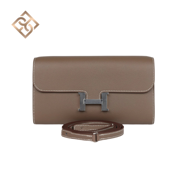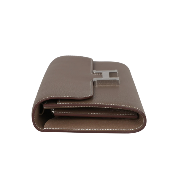 This Constance Wallet To Go is in Etoupe evercolor leather with palladium hardware and has contrast stitching, metal “H” snap lock closure, open front compartment and removable crossbody strap.