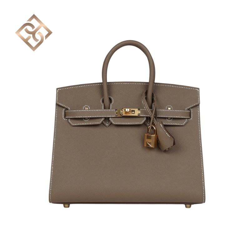 This sellier Birkin is in Etoupe epsom leather with Gold hardware and has contrast stitching, front flap, two straps with center toggle closure, clochette with lock and two keys, and double rolled handles.