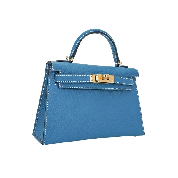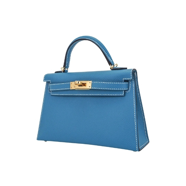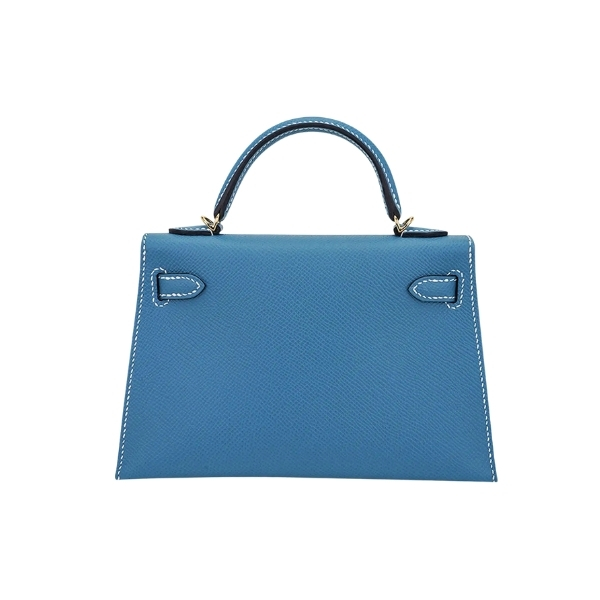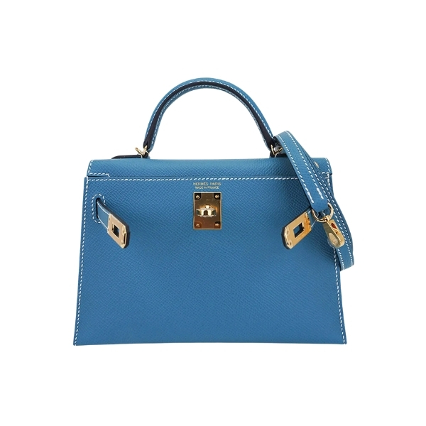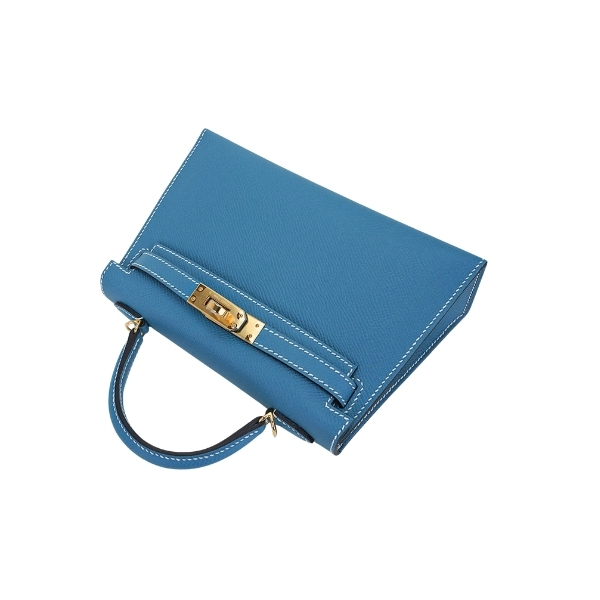 This Kelly, in the Sellier style, is in New Blue Jean Epsom Leather with gold hardware and has tonal stitching, two straps with front toggle closure, single rolled handle and removable wooly/canvas shoulder strap. The interior is lined with Bleu Brume lambskin leather and has one open pocket on the back wall.