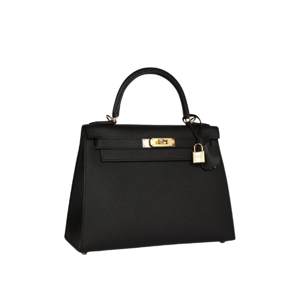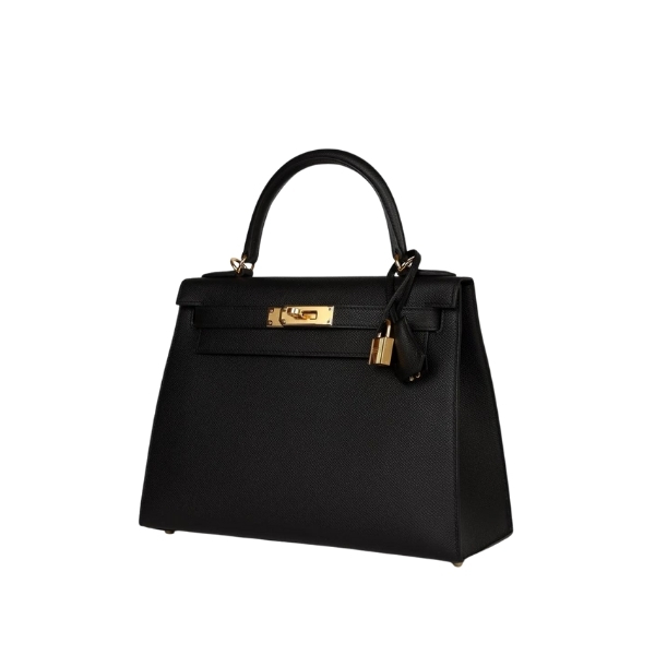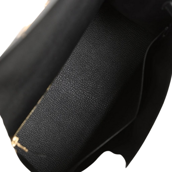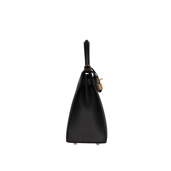This Kelly Sellier is in Black epsom leather with gold hardware and has tonal stitching, a front toggle closure, a clochette with lock and two keys, a single rolled handle and an optional shoulder strap. The interior is lined with black chevre leather and has one zip pocket with an Hermès engraved pull and two open pockets on the opposite side.