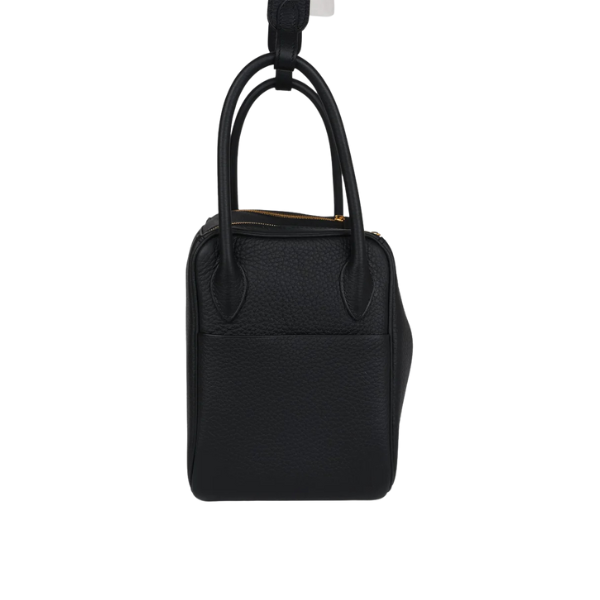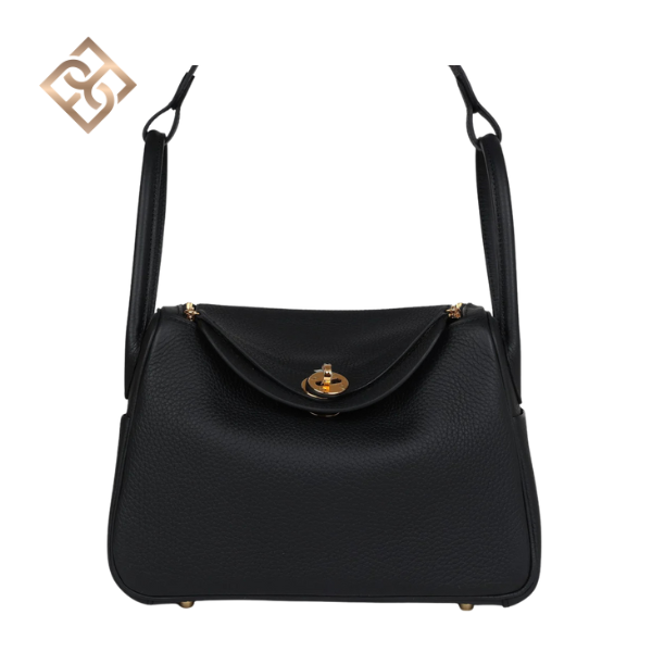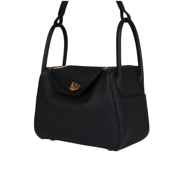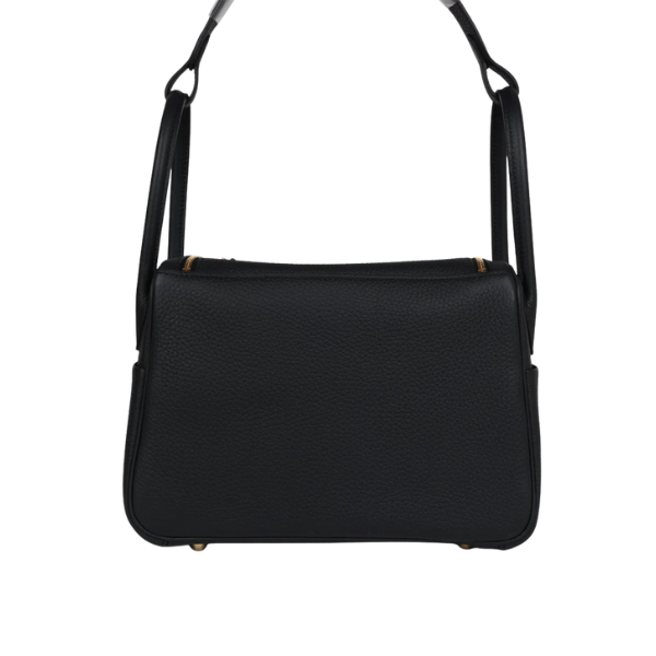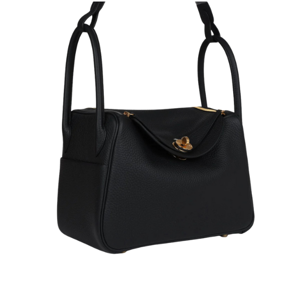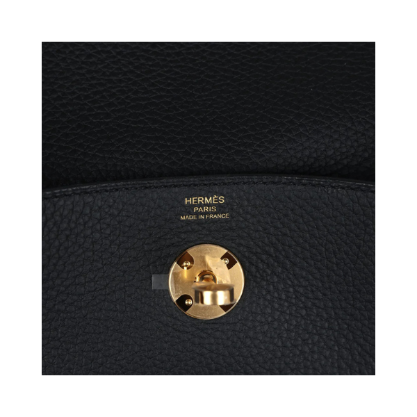 This Lindy is in Black clemence with gold hardware and features tonal stitching, double zipper pulls, center Hermès twist lock closure, five gold feet, and two top handles that are linked by a removable shoulder strap. The interior is lined with Black leather and has two side interior pockets and two exterior pockets.