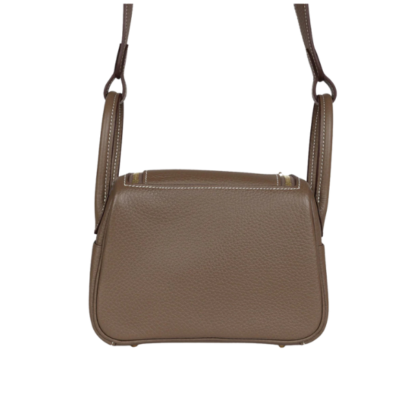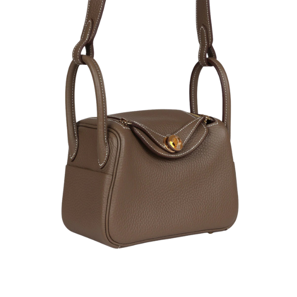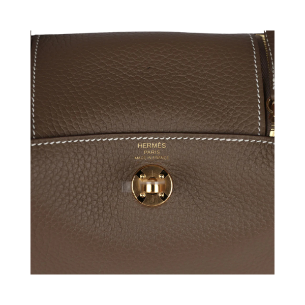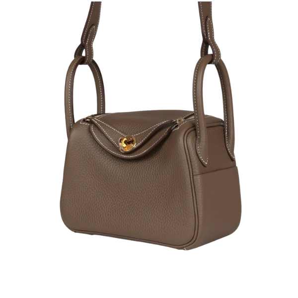 This Mini Lindy is in Etoupe clemence leather with gold hardware, has contrast stitching, double zipper pulls, front Hermès twist lock, single pocket on each side, two rolled top handles linked by a flat shoulder strap. The interior is lined with Etoupe leather and has one pocket on each side.