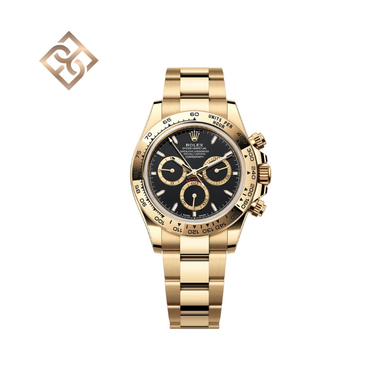 The Oyster Perpetual Cosmograph Daytona in 18 kt yellow gold with a black dial and contrasting counter rings. It features an Oyster bracelet and 18 kt yellow gold bezel with an engraved tachymetric scale.