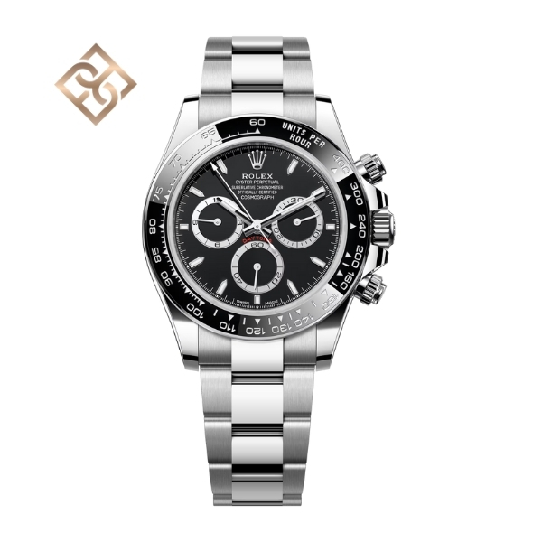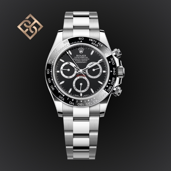 The Oyster Perpetual Cosmograph Daytona in Oystersteel with a black dial and contrasting counter rings. It features an Oyster bracelet and a black Cerachrom bezel with tachymetric scale.