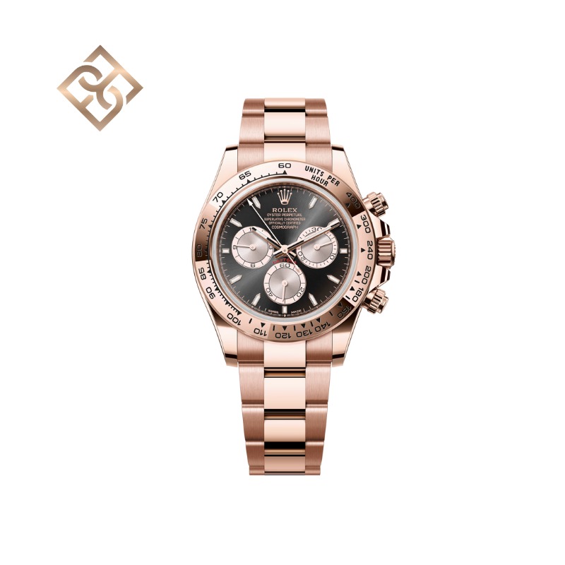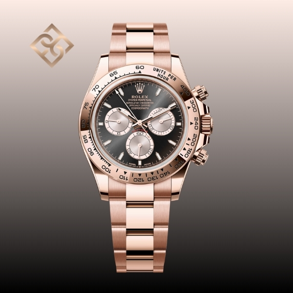 This Oyster Perpetual Cosmograph Daytona in 18 kt Everose gold, with a bright black and Sundust dial and an Oyster bracelet, features an 18 kt Everose gold bezel with an engraved tachymetric scale.