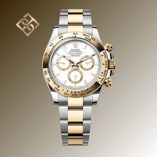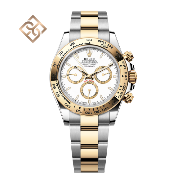 The Oyster Perpetual Cosmograph Daytona in Oystersteel and yellow gold with a white dial and contrasting counter rings. It features an Oyster bracelet and a yellow gold bezel with an engraved tachymetric scale.