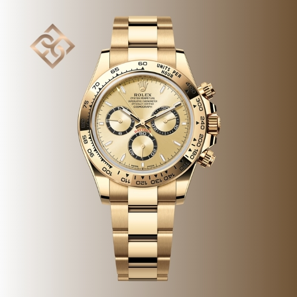The Oyster Perpetual Cosmograph Daytona in 18 kt yellow gold with a golden dial and contrasting counter rings. It features an Oyster bracelet and 18 kt yellow gold bezel with an engraved tachymetric scale.