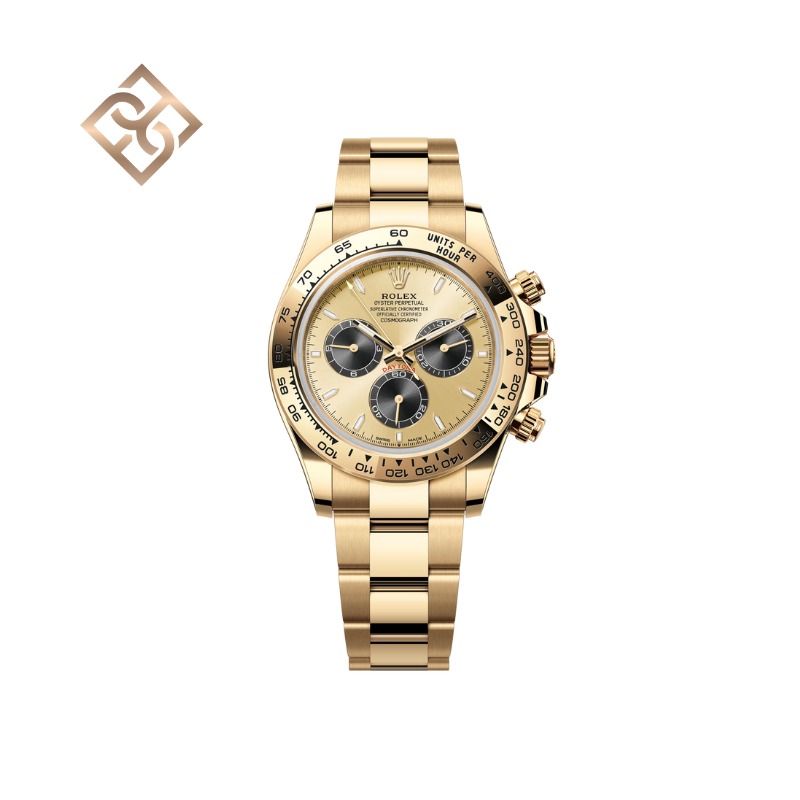 This Oyster Perpetual Cosmograph Daytona in 18 kt yellow gold, with a golden and bright black dial and an Oyster bracelet, features 18 kt yellow gold bezel with an engraved tachymetric scale.