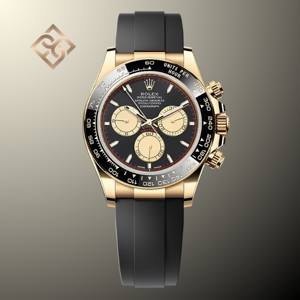 This Oyster Perpetual Cosmograph Daytona in 18 kt yellow gold, with an intense black and champagne-colour dial and an Oysterflex bracelet, features a black Cerachrom bezel with tachymetric scale.