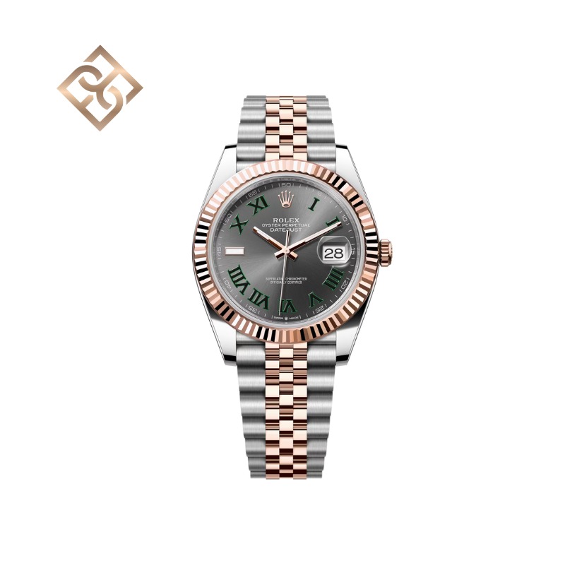 This Oyster Perpetual Datejust 41 in Oystersteel and Everose gold features a slate dial and a Jubilee bracelet.