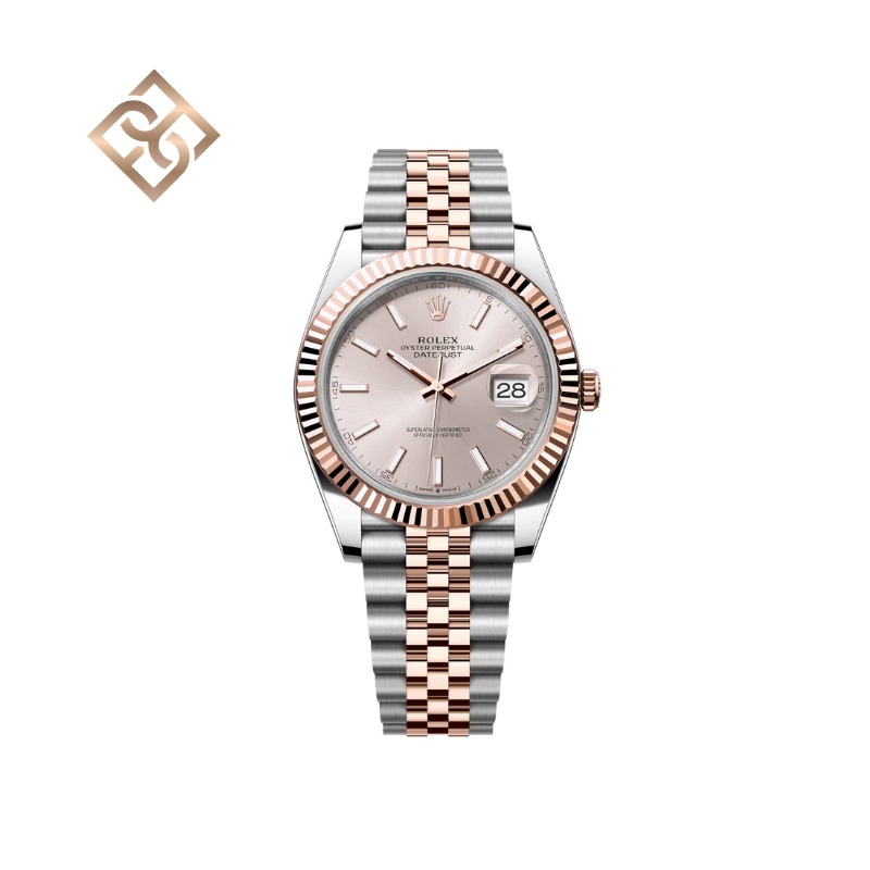 This Oyster Perpetual Datejust 41 in Oystersteel and Everose gold features a sundust dial and a Jubilee bracelet.