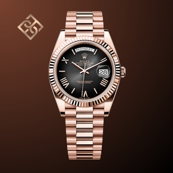 The Oyster Perpetual Day-Date 40 in 18 kt Everose gold with a slate ombré dial, fluted bezel and a President bracelet.