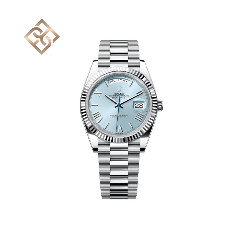 The Oyster Perpetual Day-Date 40 in platinum with an ice-blue dial, fluted bezel and a President bracelet.