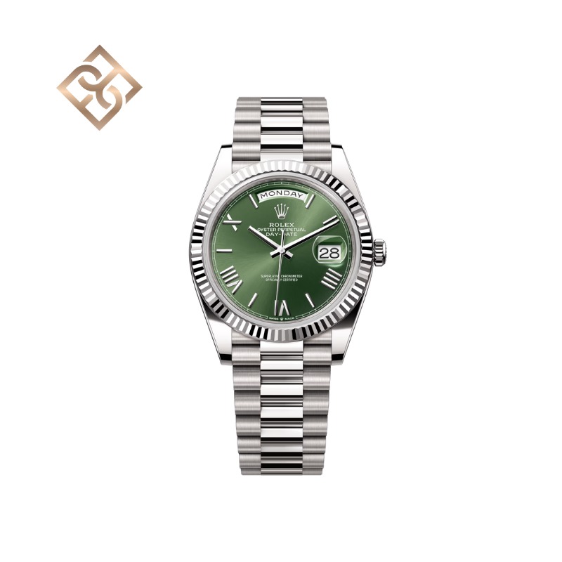 The Oyster Perpetual Day-Date 40 in 18 kt white gold with an olive green dial, fluted bezel and a President bracelet.