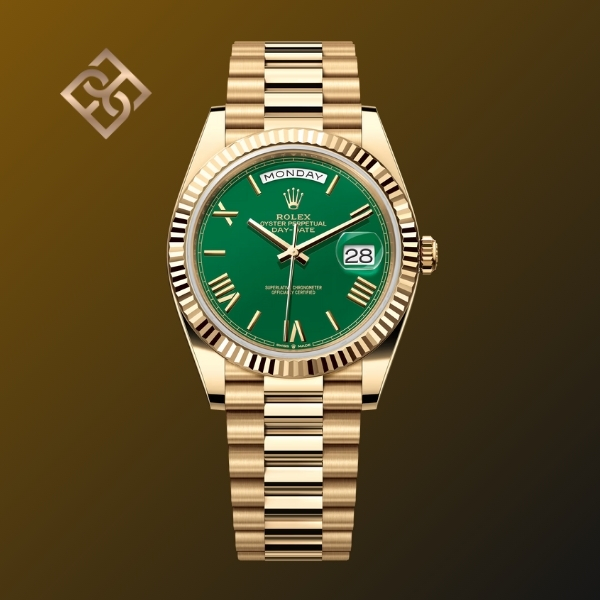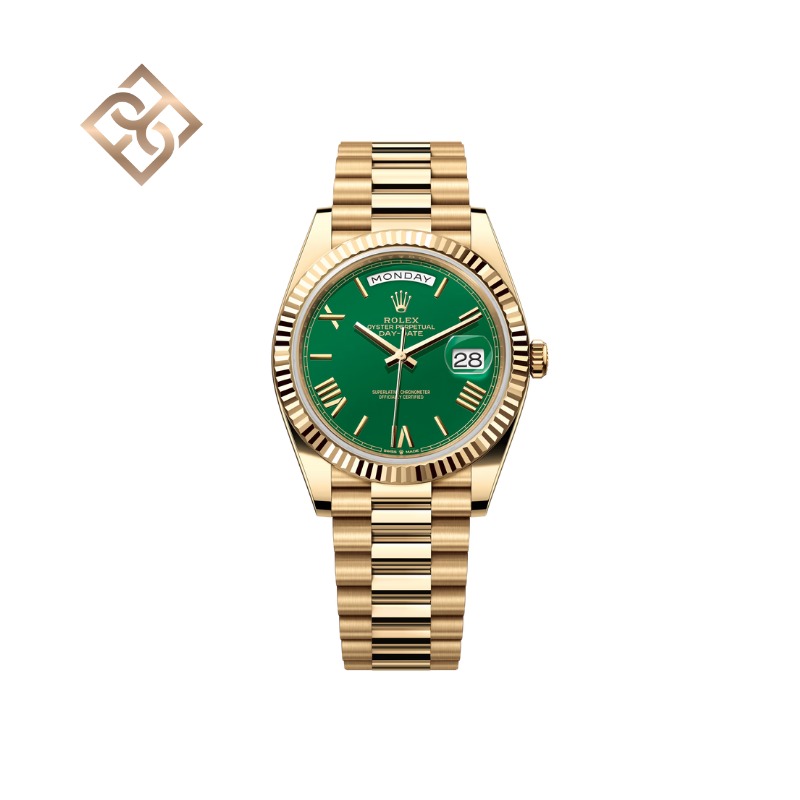 The Oyster Perpetual Day-Date 40 in 18 kt yellow gold with a green dial, fluted bezel and a President bracelet.