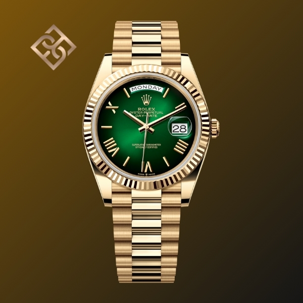 The Oyster Perpetual Day-Date 40 in 18 kt yellow gold with a green ombré dial, fluted bezel and a President bracelet.