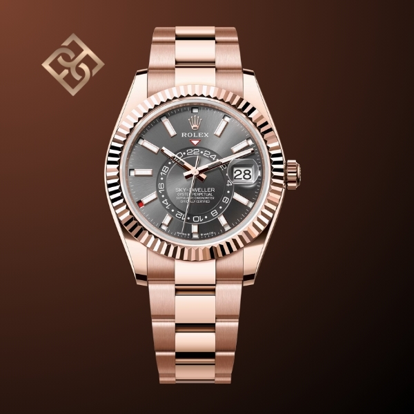 The Oyster Perpetual Sky-Dweller in 18 kt Everose gold with a slate dial and an Oyster bracelet.