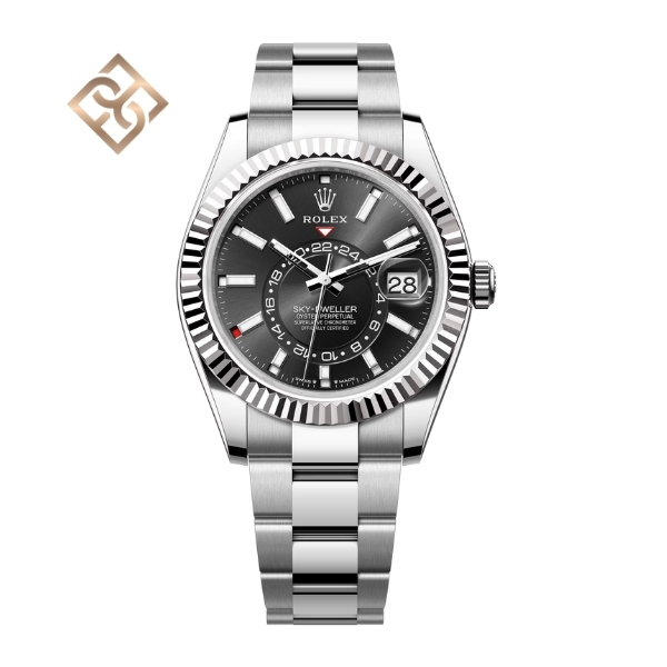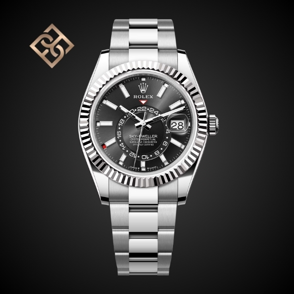 The Oyster Perpetual Sky-Dweller in Oystersteel and white gold with a bright black dial and an Oyster bracelet.