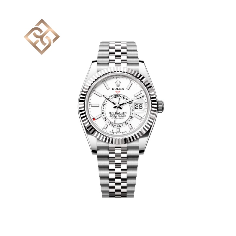 The Oyster Perpetual Sky-Dweller in Oystersteel and white gold with an intense white dial and a Jubilee bracelet.